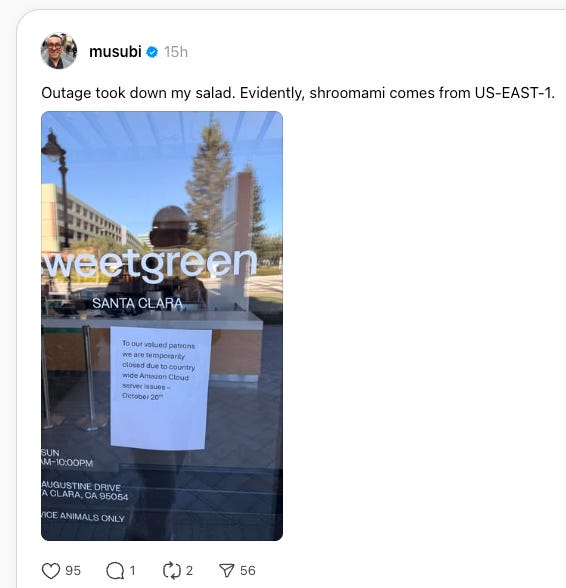 The outage also caused trouble for restaurant tech companies including delivery services DoorDash and Grubhub and point of sale and payments provider Toast. Issues affected operations at Starbucks and Sweetgreen and McDonald’s — and those are just examples I found in the first few minutes of Google searching.