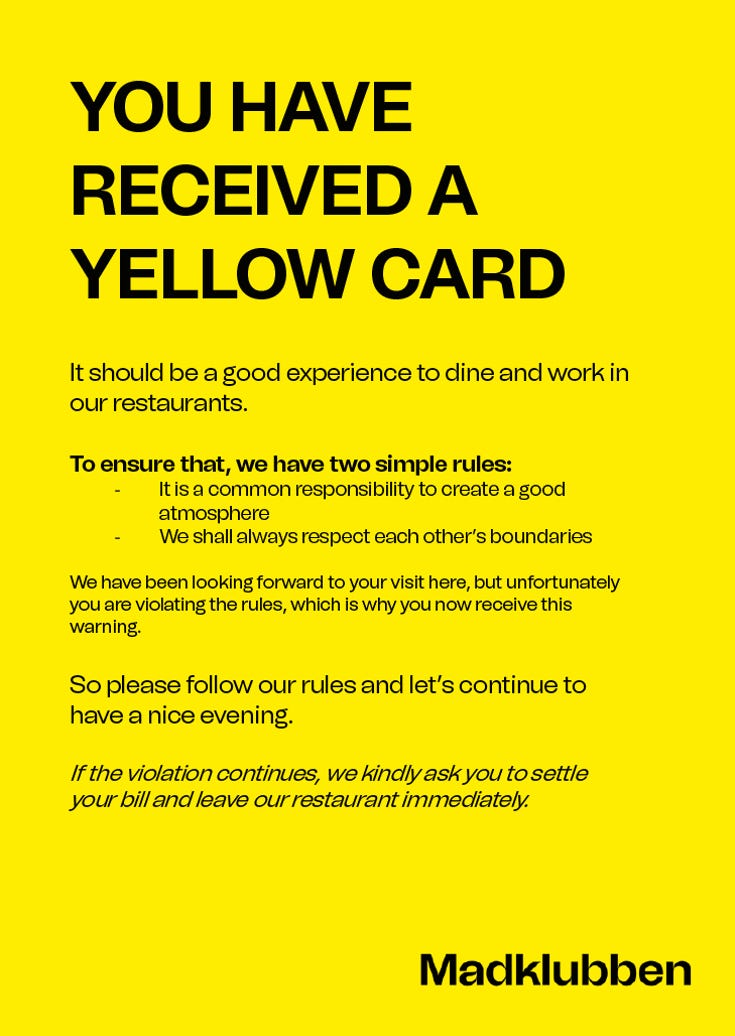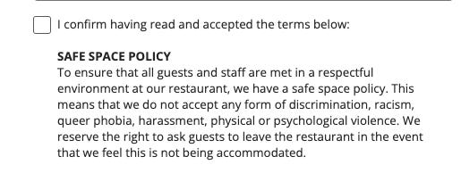 Madklubben, a large and unmissable restaurant group in Denmark (I think I ate my first-ever dinner in Copenhagen at a Madklubben a decade ago) has a “safe space policy” inside its reservation terms. The terms bans harassment and violence and are listed alongside other policies about reservation changes, arrival times, and payments. Diners must agree to it before booking.